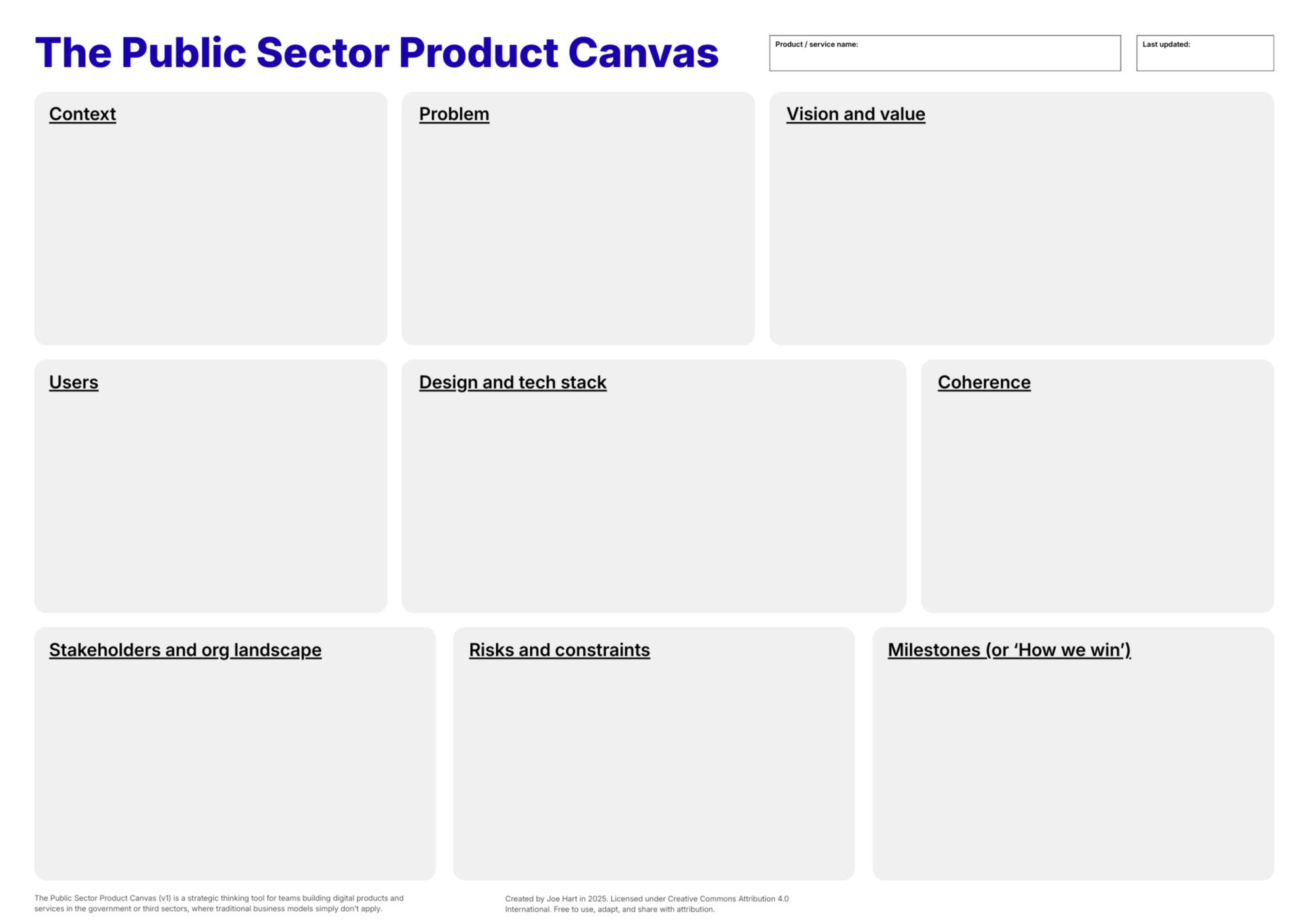 The Public Sector Product Canvas is a purpose-built strategic thinking tool for teams building digital products and services in the public sector. It's designed for the reality of delivery in government: political constraints, legacy systems, and a complex stakeholder landscape.
