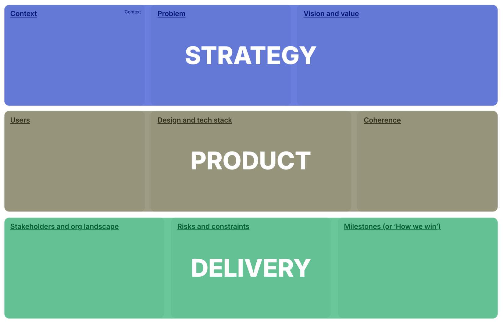 Nine boxes across three layers: your product strategy broken down on a single page.